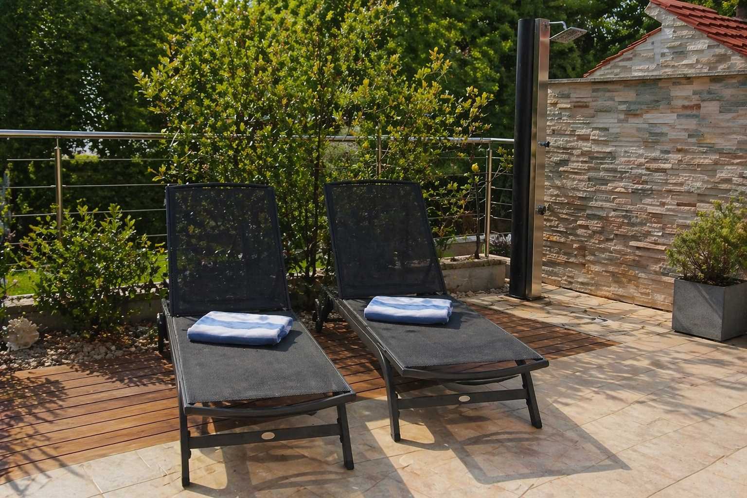 The highlight of the apartment is the spacious, shaded terrace, complete with a table for multiple people, a grill, and a counter with a sink for preparing fresh seafood. The centerpiece of the terrace is the heated jacuzzi, where you can relax in complete privacy while enjoying the greenery. Additional amenities include air conditioning, mosquito nets, blinds, bed linen, towels, and a private parking space by the house, ensuring comfort and security.