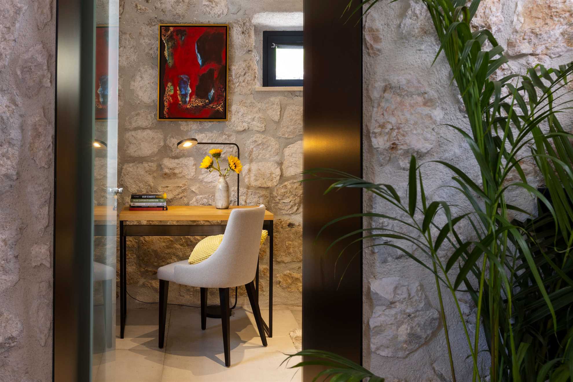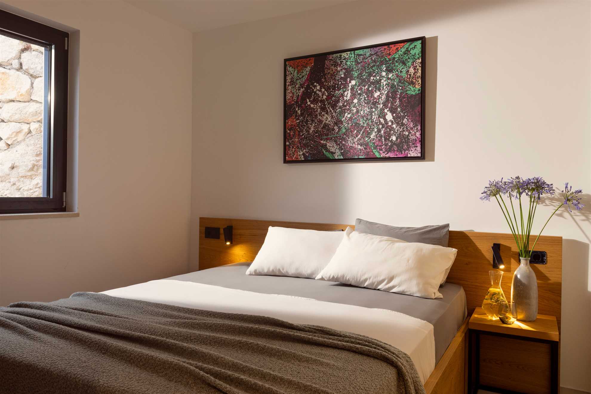Along the scenic coastline lies the luxurious Villa Kora, a symphony of elegance and craftsmanship. The 220 m2 interior is adorned with carefully chosen modern furniture that strikes a perfect balance between comfort and style while the creative use of fabrics and colorful artwork add a playful yet sophisticated touch with quirky light fixtures dangling from the ceilings. An airy living room is inviting with a large sofa and a flat screen TV insuring pleasurable lazy day. In addition to a fully equipped kitchen and a dining room there are four unique bedrooms, each with its own distinct character, quality furnishings and artistic touches.