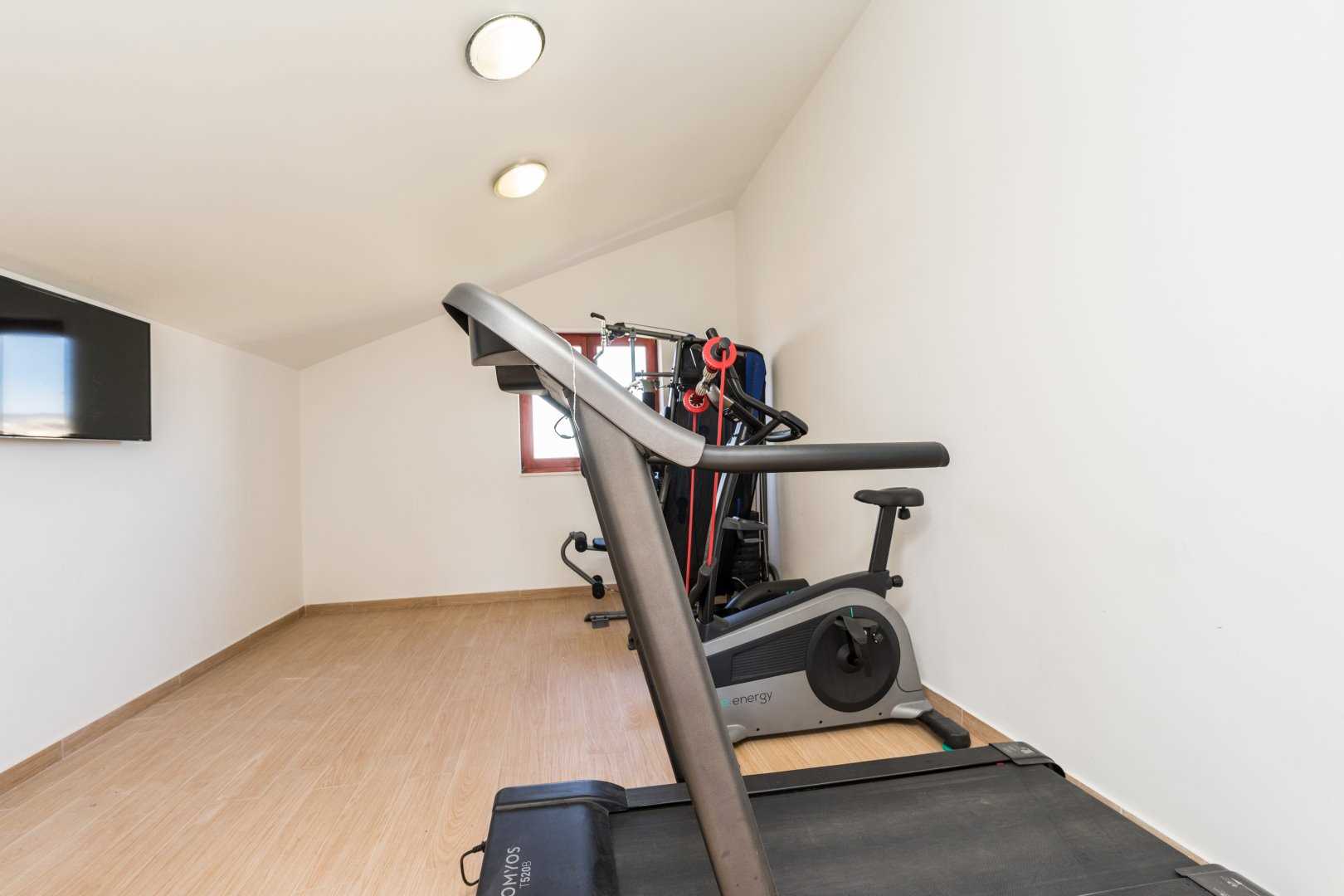 The second floor is dedicated to relaxation and active leisure. It features a private fitness room with a treadmill, strength equipment, and space for exercise. For complete relaxation, there is also a dry sauna, a bathroom with a shower, and a cozy lounge area with a TV and access to another panoramic balcony.