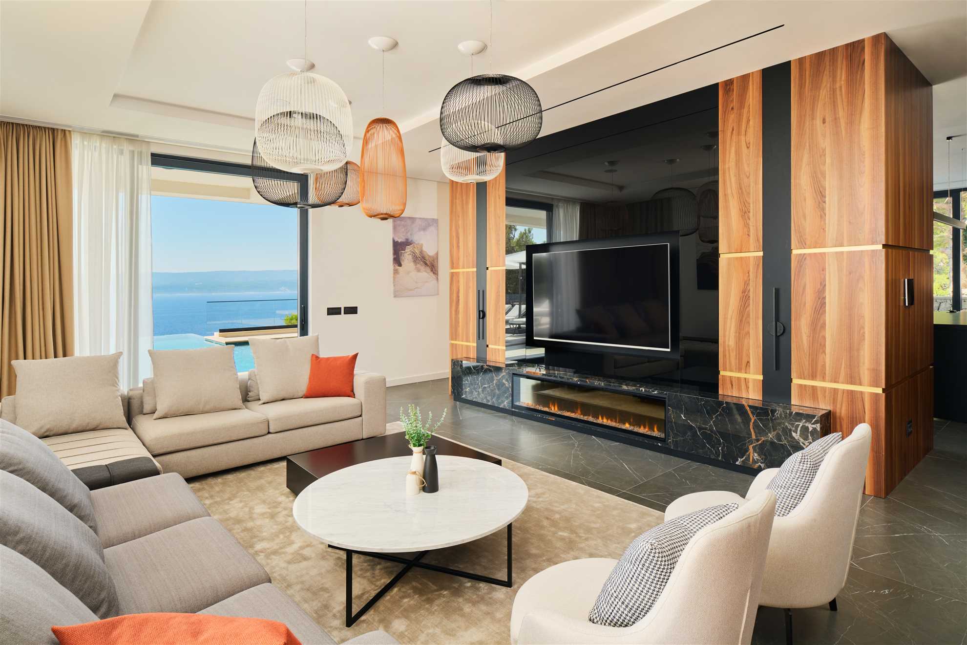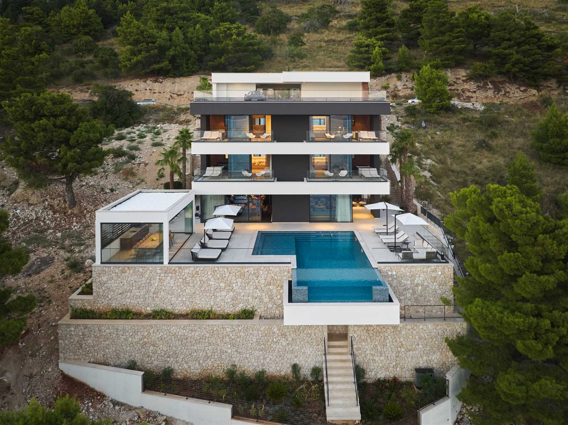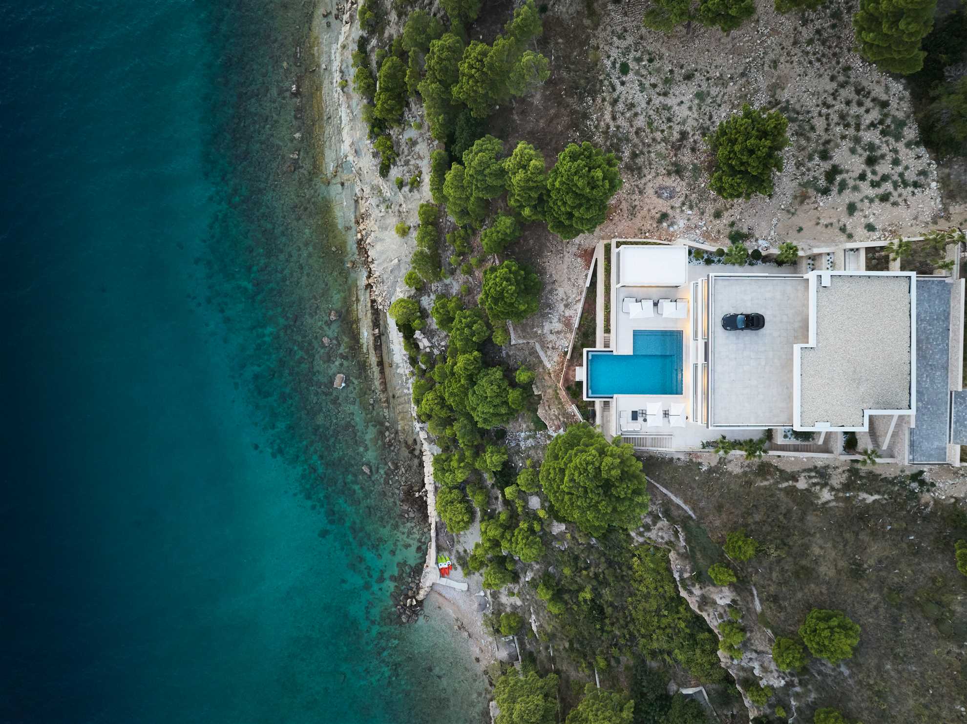 Welcome to a breathtakingly luxurious villa situated along the picturesque Dalmatian seashore. Upon entering, guests are greeted with a sense of grandeur, as every room exudes sophistication and style. The extraordinary Seashore Belle boasts 8 spacious ensuite bedrooms, each a sanctuary of comfort and elegance, adorned with lavish furnishings in beautiful colors. Four of the bedrooms face the sea and have access to the terrace each with each own jacuzzi inviting guests to unwind in blissful serenity. Outside, a heated infinity pool glistens with sweeping vistas of the azure waters. Plenty of sun loungers with umbrellas are provided ensuring relaxing days in the sun. A separate outdoor kitchen is provided, accompanied by a spacious dining table where dining to a refreshing sea breeze and undisturbed sea views is an every day reality. Fitness enthusiasts may continue with the wellness plan in a dedicated workout room while those seeking rejuvenation may take advantage of the spa room, complete with a sauna and an indoor pool - a haven of tranquility. With impeccable amenities, unparalleled location and every conceivable luxury Villa Seashore Belle promises an unforgettable retreat where dreams merge with reality.