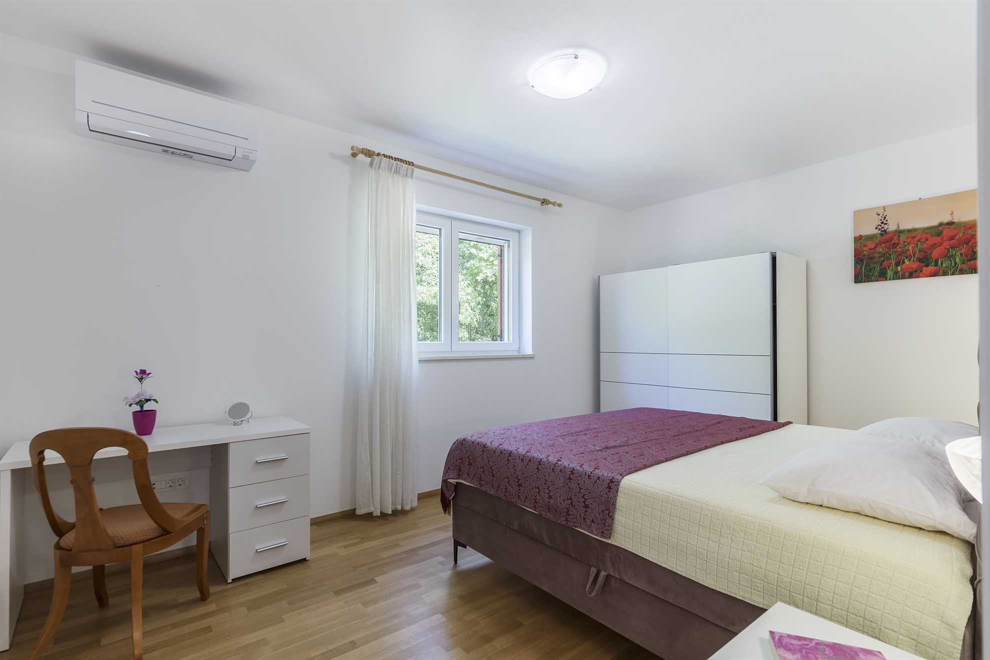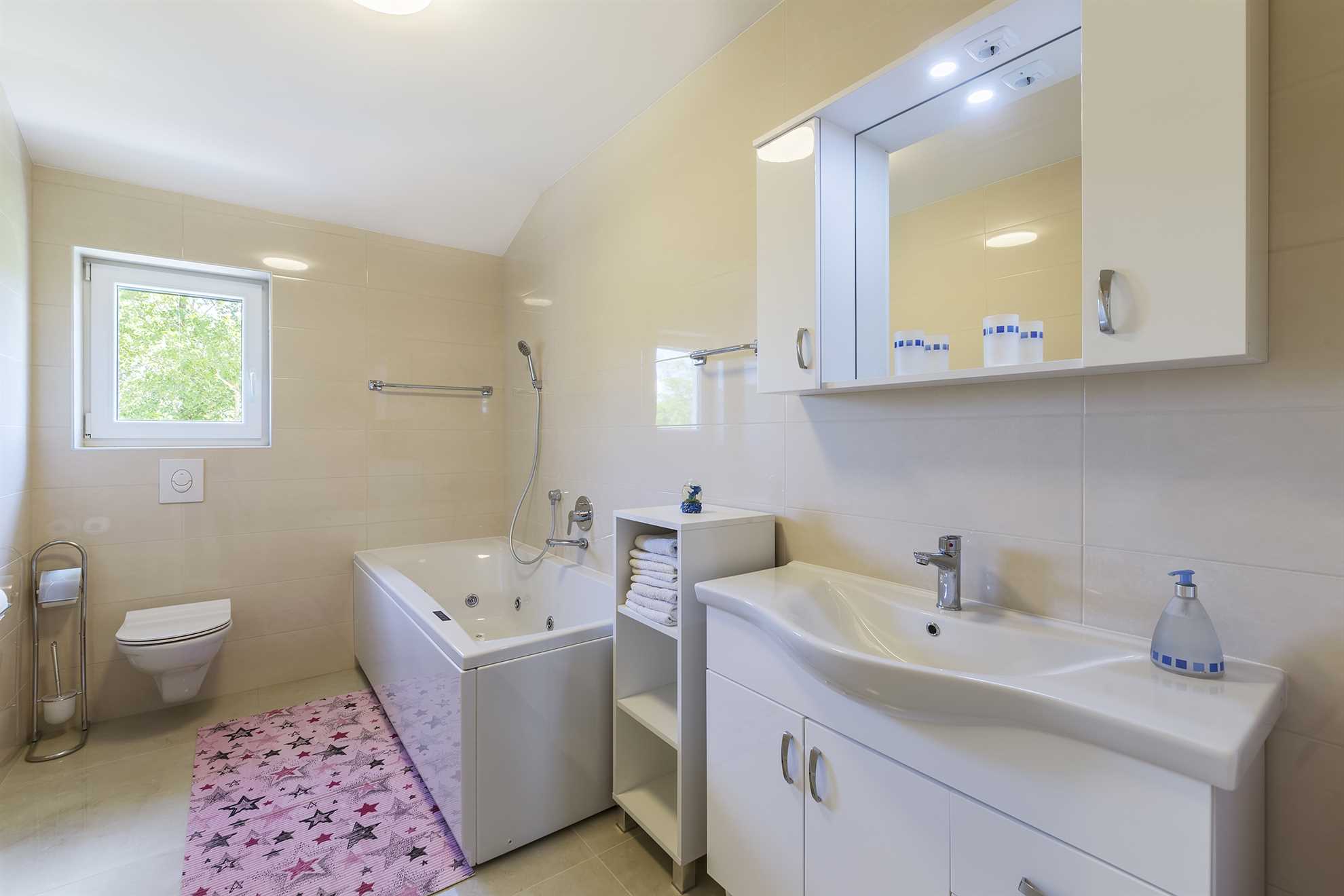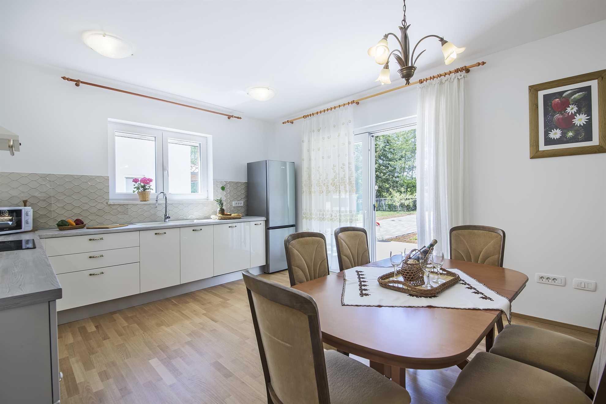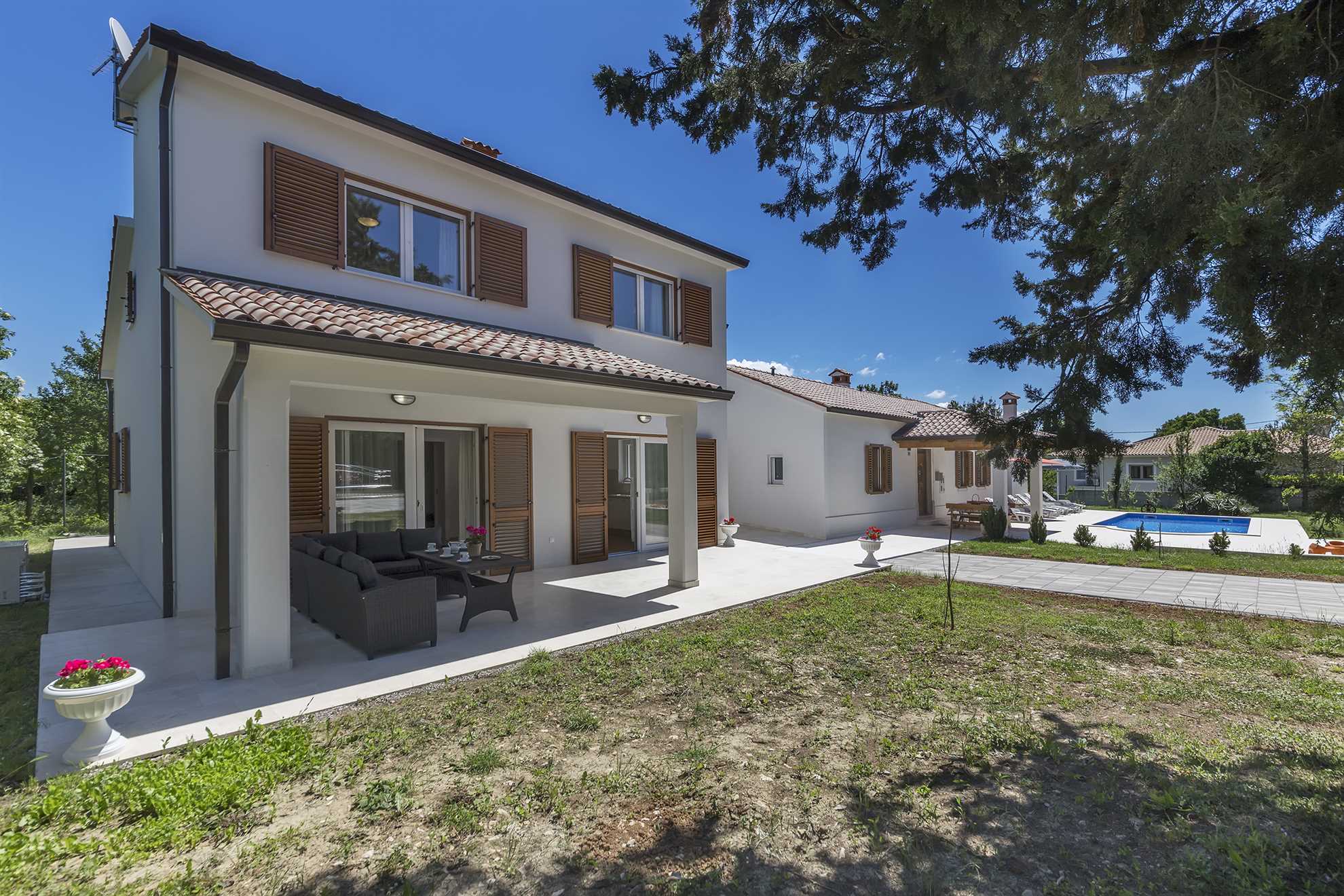 This charming villa is located on a spacious plot of over 4,000 square meters and is surrounded by greenery, which contributes to a peaceful and pleasant environment. The villa offers its guests accommodation in two separate buildings, one next to the other, which provides additional privacy during the stay. The villa can accommodate 12 people in a total of 6 bedrooms, which are distributed in both houses. Each house, in addition to bedrooms and bathrooms, also has its own fully equipped kitchen, living room and dining room. The pool with salt water is located on the terrace, which is a favourite location for relaxing but also for preparing specialties since the barbecue is in the immediate vicinity. In order to hide from the sun, there is also a covered area with garden furniture. This villa is truly an ideal choice for a peaceful and pleasant vacation with family or friends.