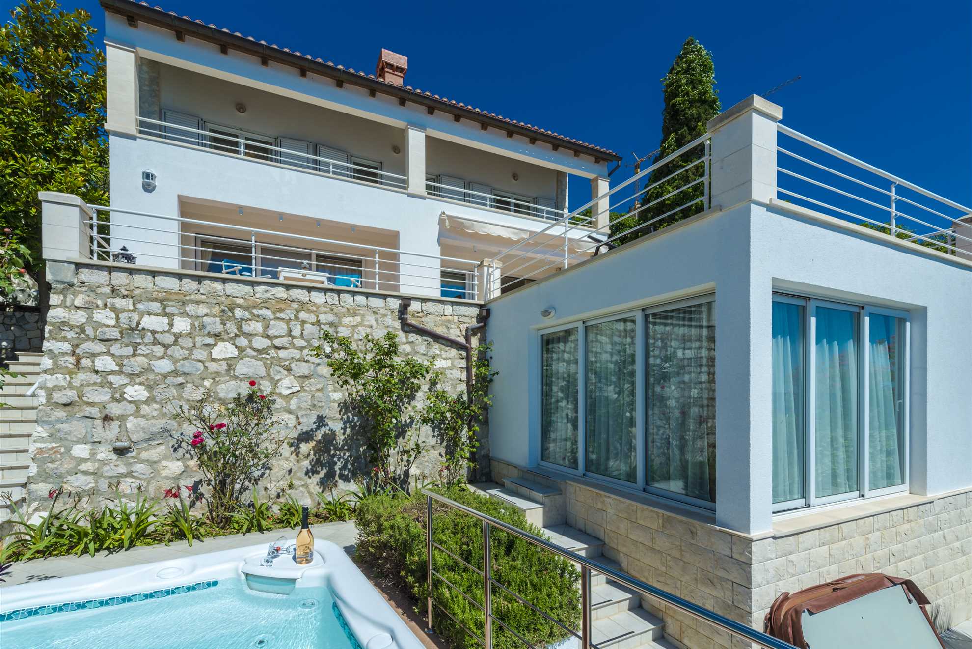 Discover a serene coastal haven just a brief 13-minute drive from Dubrovnik, where the charming Seaside Villa Kay awaits. Offering five bedrooms distributed over two levels, each with captivating sea views, along with a comfortable lounge, fully equipped kitchen and a welcoming dining area, the villa provides ample space for relaxation and entertainment. Lush outdoor spaces ensure tranquility providing picturesque al-fresco dining terrace with panoramic vistas of the Elafiti islands, and private access to the sea. Unwind in a jacuzzi and enjoy the sun in one of the sun beds while indulging in endless views of the Adriatic. We invite you to embrace the serene ambiance of the Croatian coastline, with an occasional escape to the most iconic city Dubrovnik.