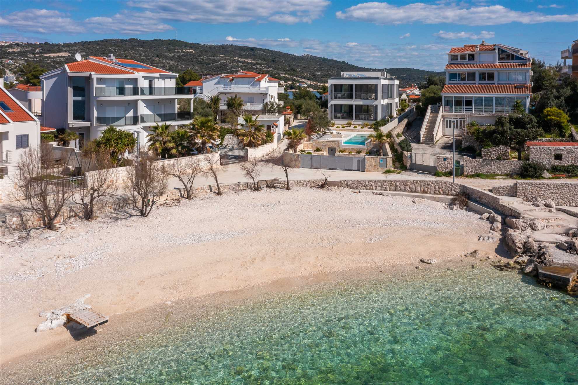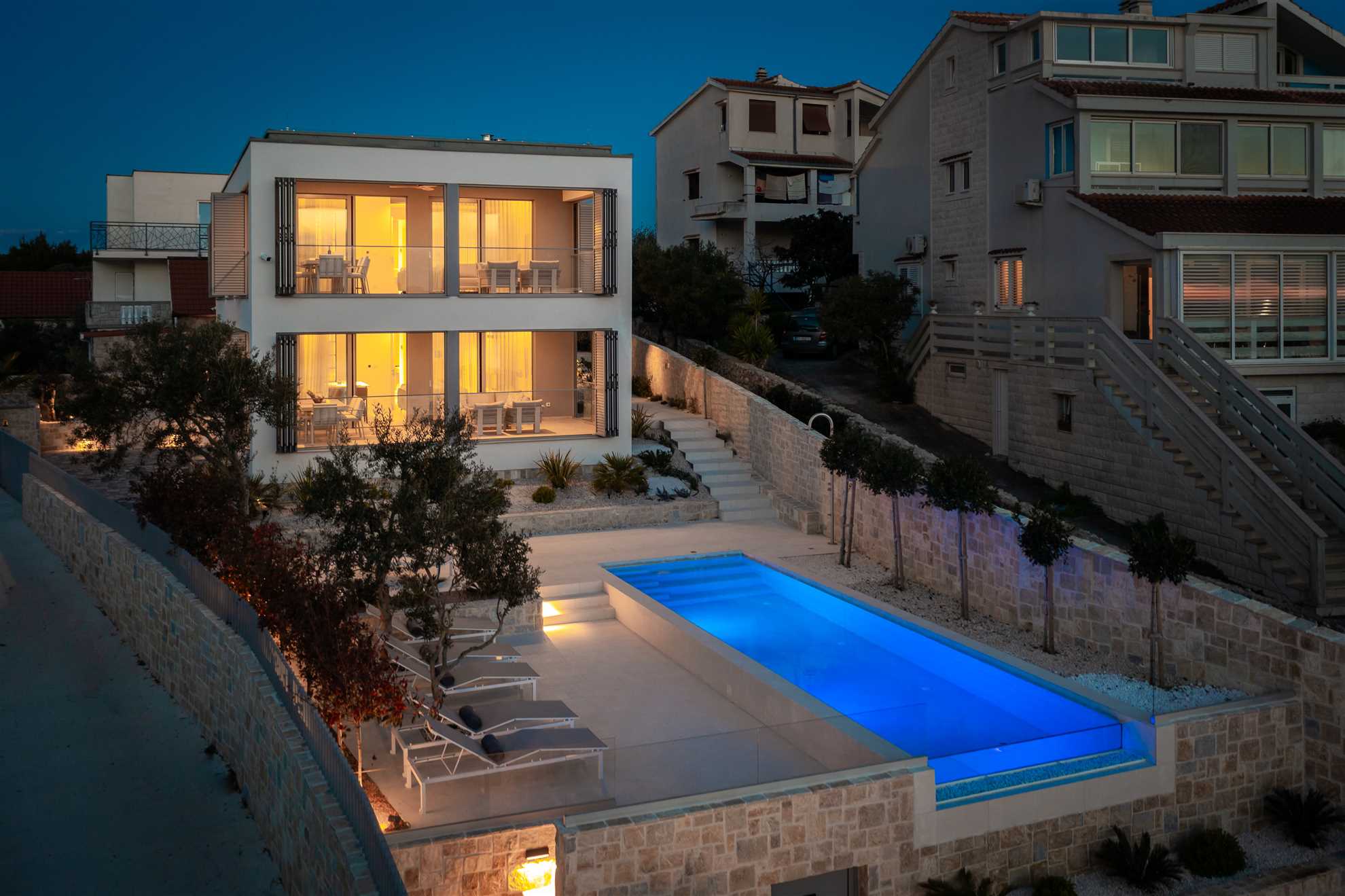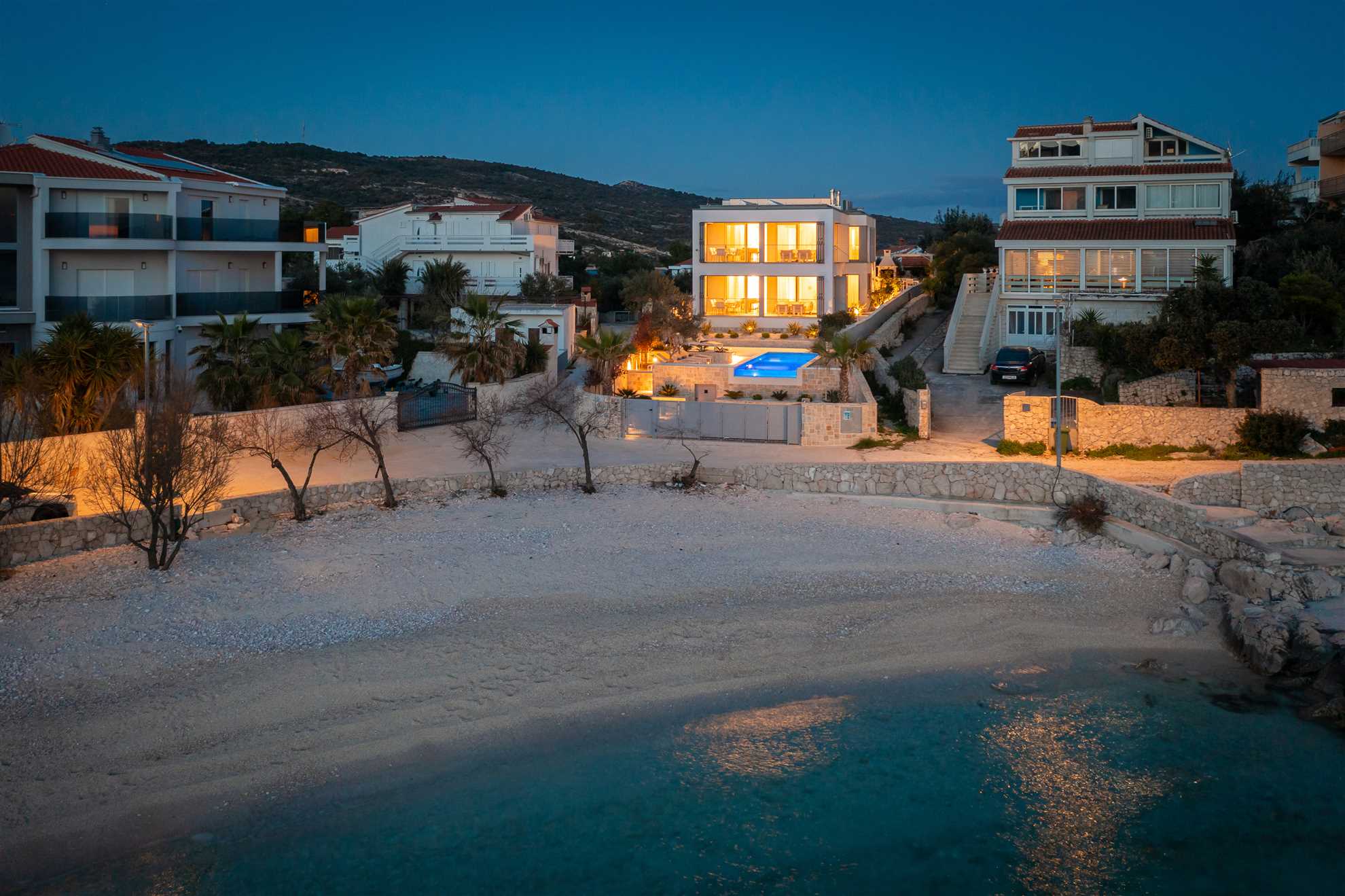 Welcome to your ultimate holiday retreat, Beachside Villa Oro. This magnificent beachfront villa stands proudly across two floors, encompassing 300 square meters of elegant interior. Three bedrooms on each level ensure ample space and comfort for all guests. Indulge in relaxation with a dedicated spa room, complete with a gym, sauna, and jacuzzi. Two enclosed summer terraces, approachable from each of the floors, are an ideal setting for enjoying views of the horizon any time of day. Once outside, you’ll be greeted by a heated MAGNA pool, a summer kitchen with authentic built in BBQ and an alfresco dining area, perfect for lovely times spent together. We invite you to immerse yourself in the beauty and luxury of Villa Oro, where every moment is destined for relaxation and enjoyment.