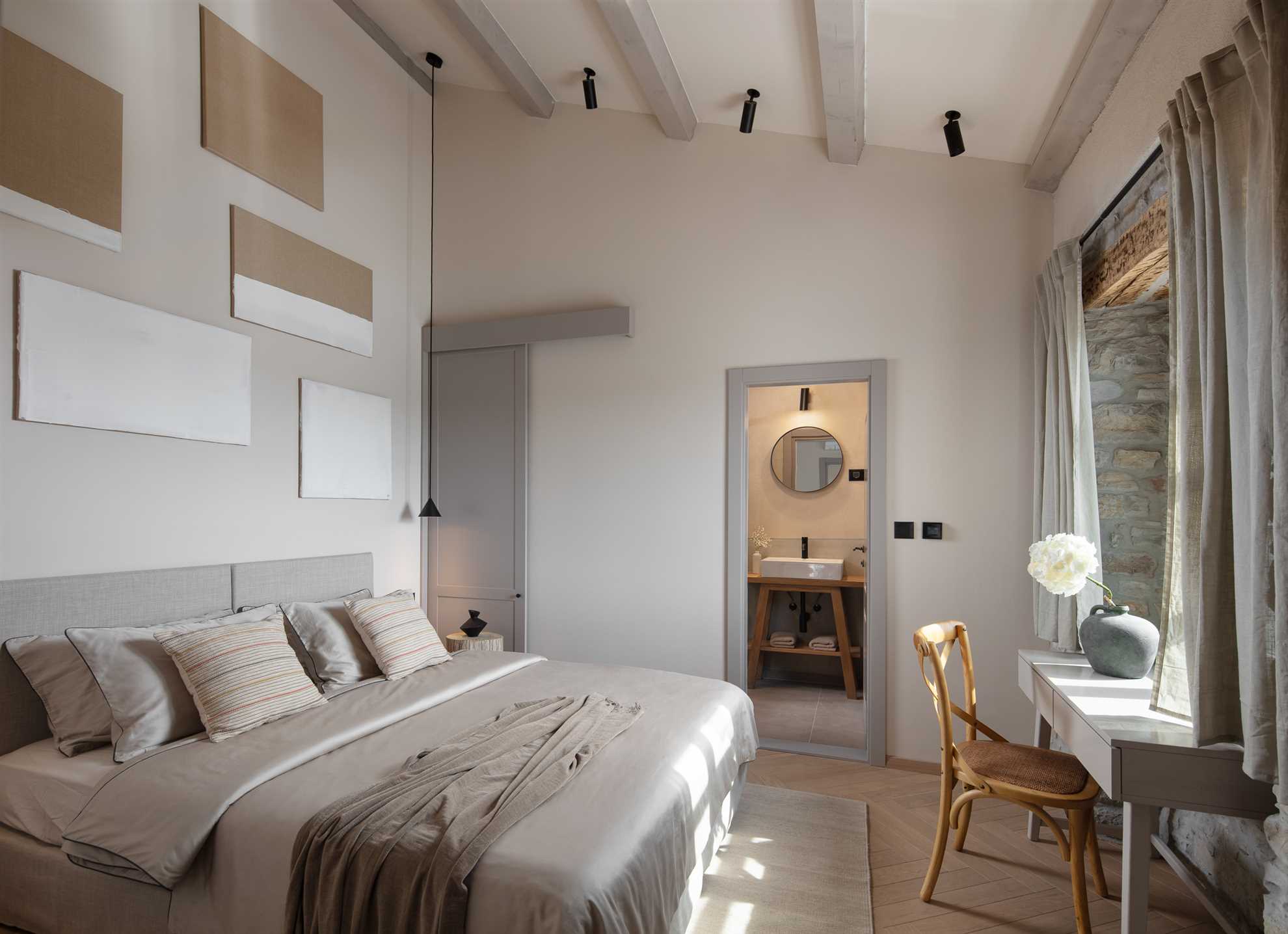 A modern, black, metal staircase will take you from the ground floor to the first floor, into the sleeping area with three beautiful bedrooms, each with its own en suite bathroom, wardrobe and closet for storing personal belongings. One of them is the master bedroom, with a large, king-size bed, a spacious bathroom, a comfortable area for sitting or reading. In that master bedroom there is also a wood-burning fireplace, bringing additional warmth and atmosphere during your stay in the colder months with a book and a glass of high-quality wine, before sleep. Two of the bedrooms also have the possibility of converting their double beds into two single beds upon request.