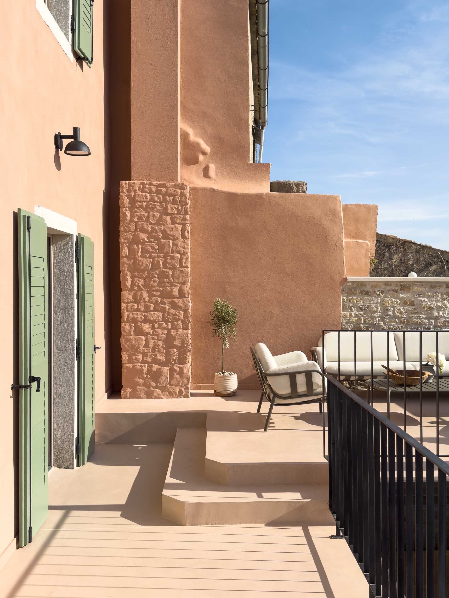 The large and wide stairs that lead to the grill easily become a place to sit, and next to them, in the shade of the covered part of the terrace, there is another intimate corner for entertainment and a small bench.