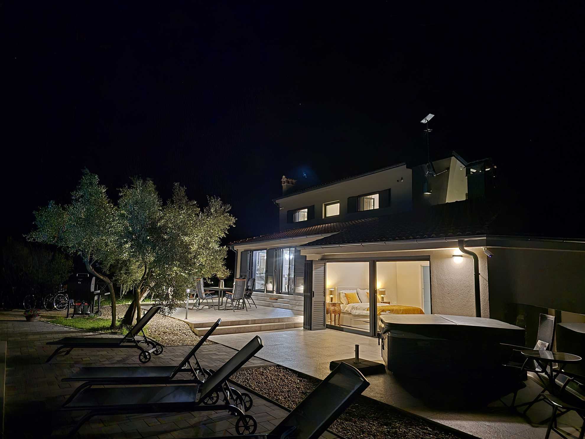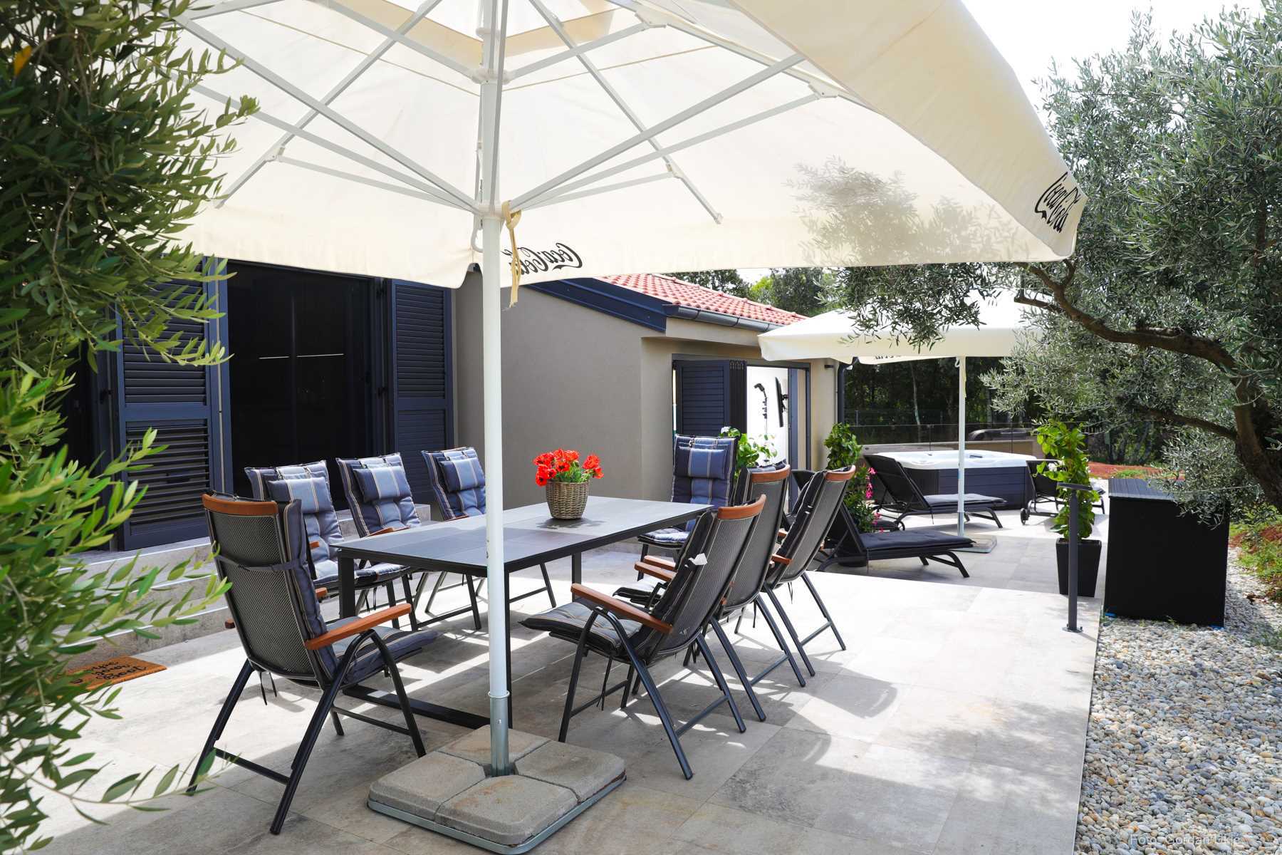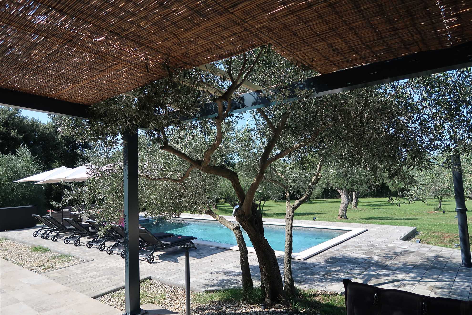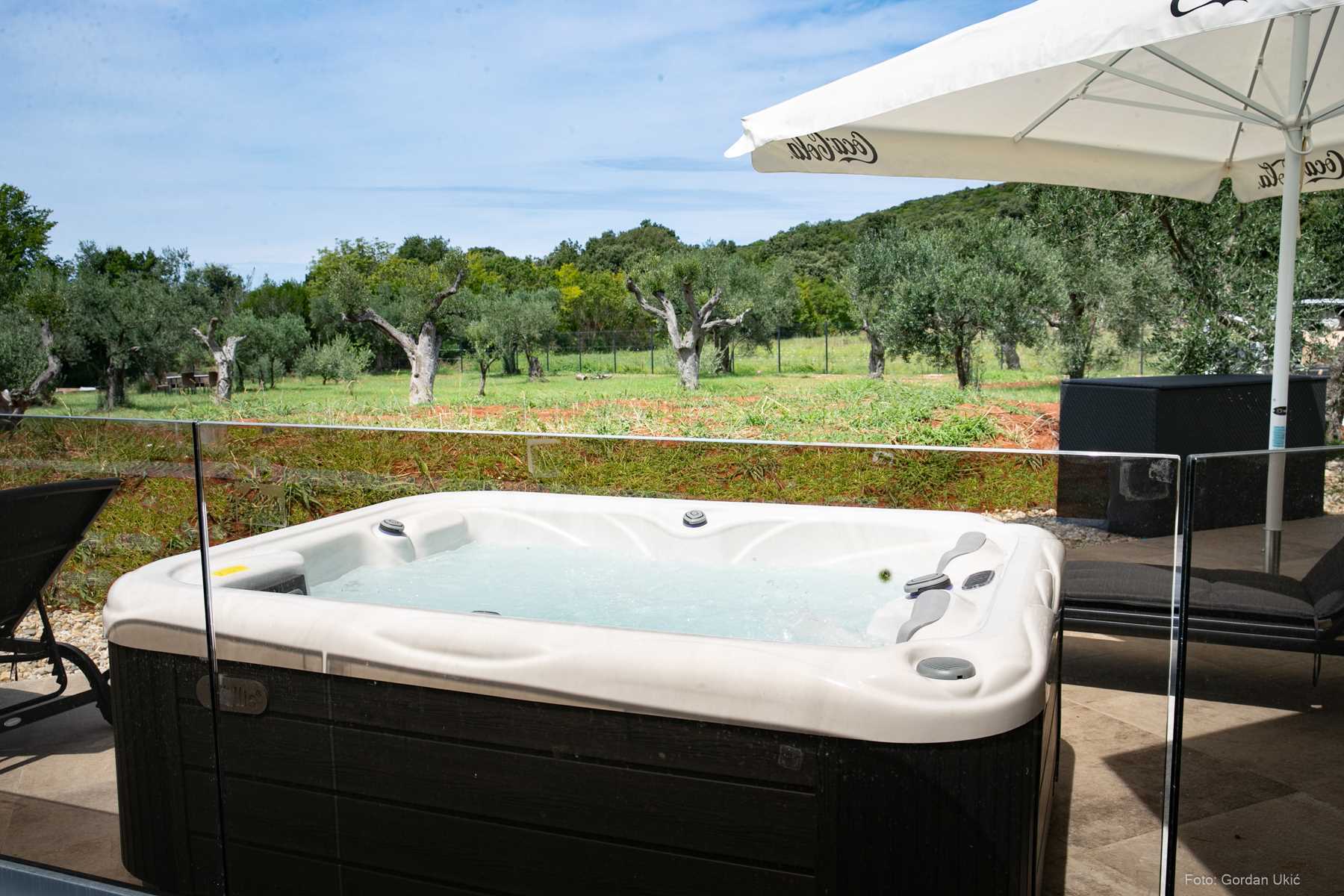 Going out to the terrace, there is an outdoor dining area and an outdoor kitchen you can use, as well as a barbecue grill. The terrace is also furnished with sun loungers and sun umbrellas to best enjoy in the amazing hot tub or in the fresh water of the swimming pool. The house is surrounded by a big olive garden (5000sqm) which makes it a perfect location for families with kids. The area is very calm and quiet so you can enjoy in the peace, the sun and the nature and simply relax! Everything you may need can easily be reached by car, but cycling, running and walking routes are all available close by, leading you to the gorgeous Rovinj beachline or to the town center.