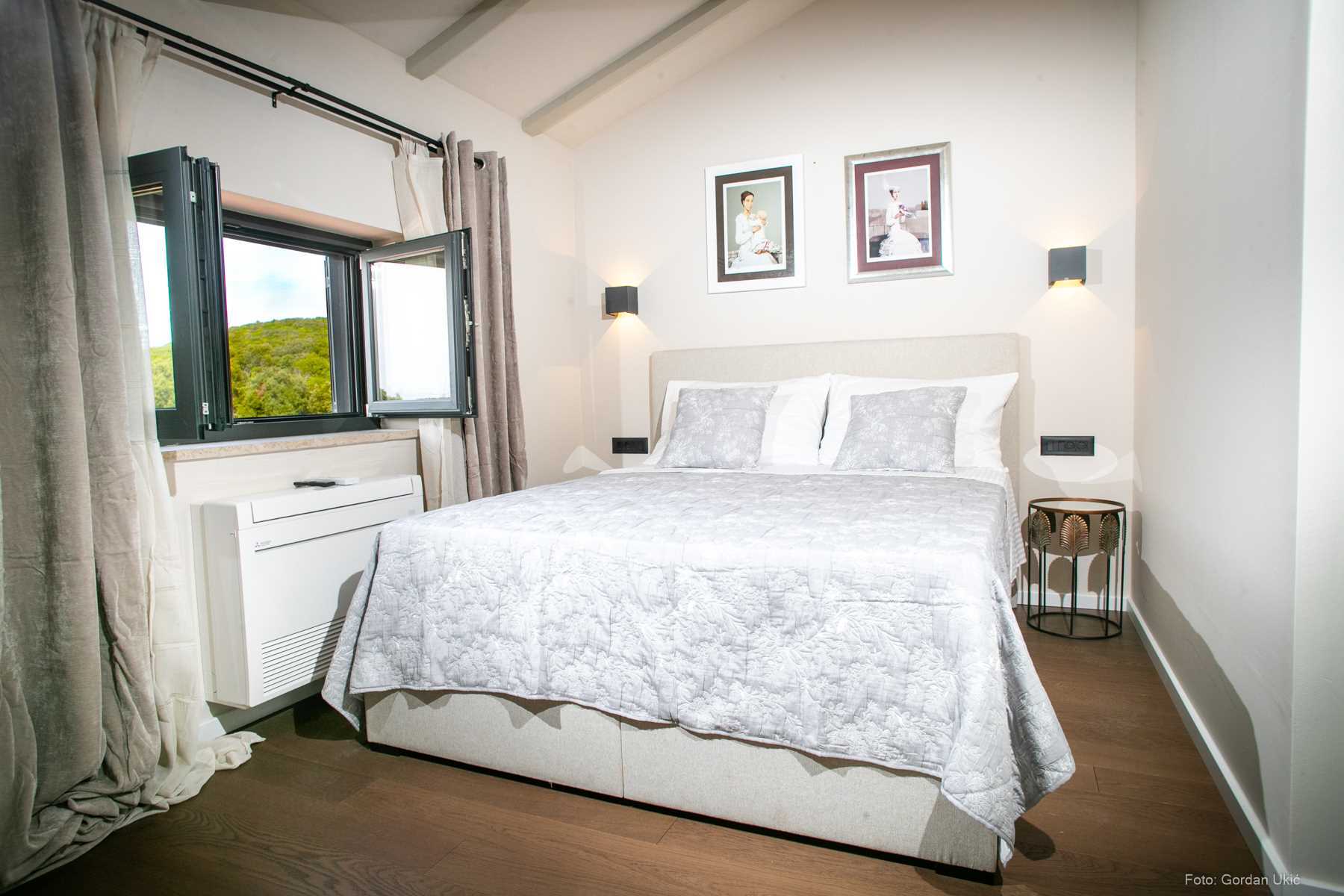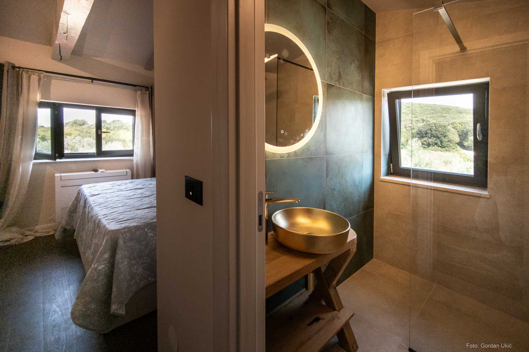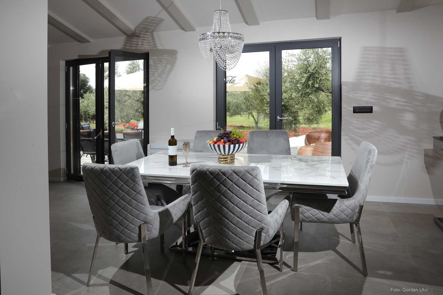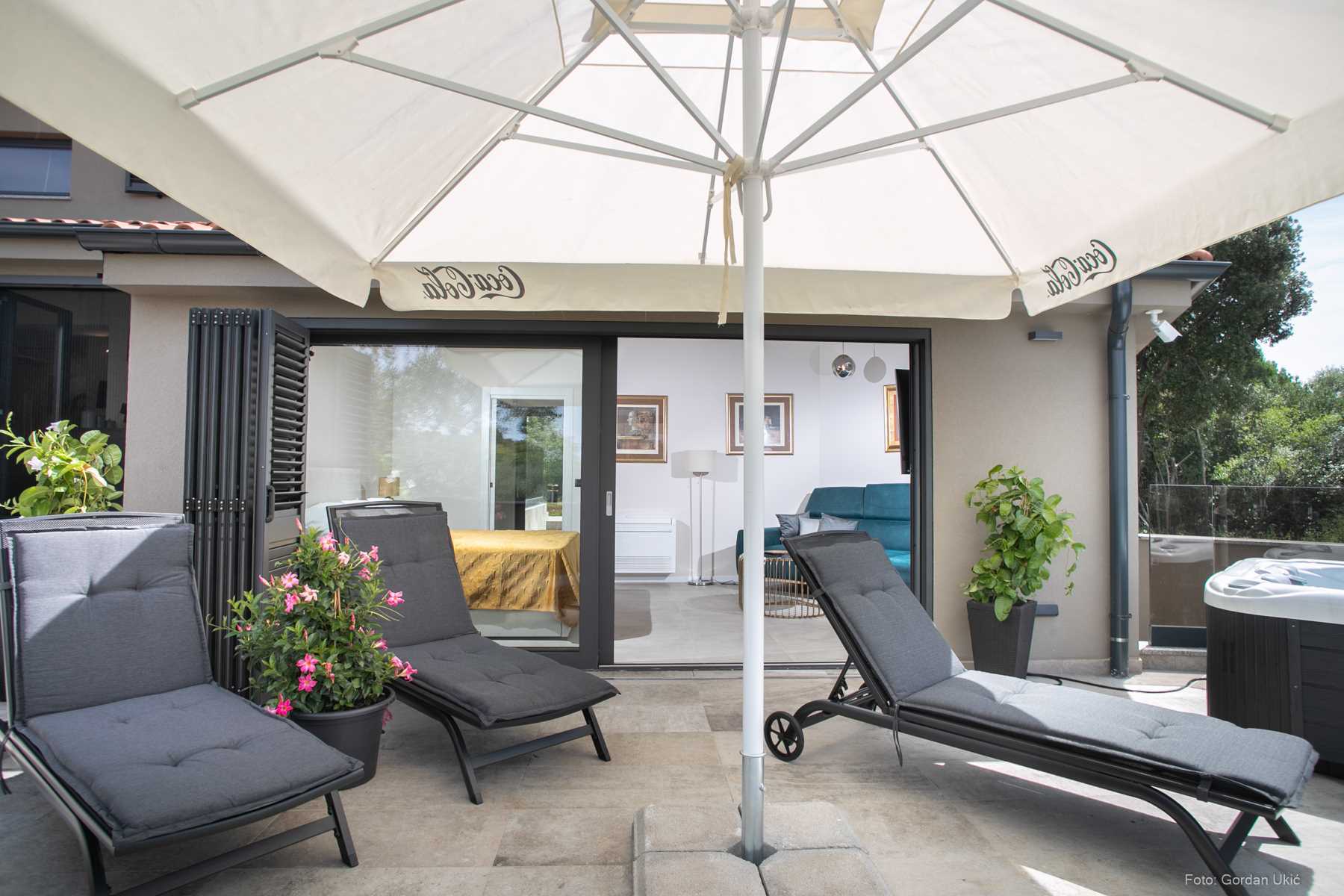 Going out to the terrace, there is an outdoor dining area and an outdoor kitchen you can use, as well as a barbecue grill. The terrace is also furnished with sun loungers and sun umbrellas to best enjoy in the amazing hot tub or in the fresh water of the swimming pool. The house is surrounded by a big olive garden (5000sqm) which makes it a perfect location for families with kids. The area is very calm and quiet so you can enjoy in the peace, the sun and the nature and simply relax! Everything you may need can easily be reached by car, but cycling, running and walking routes are all available close by, leading you to the gorgeous Rovinj beachline or to the town center.