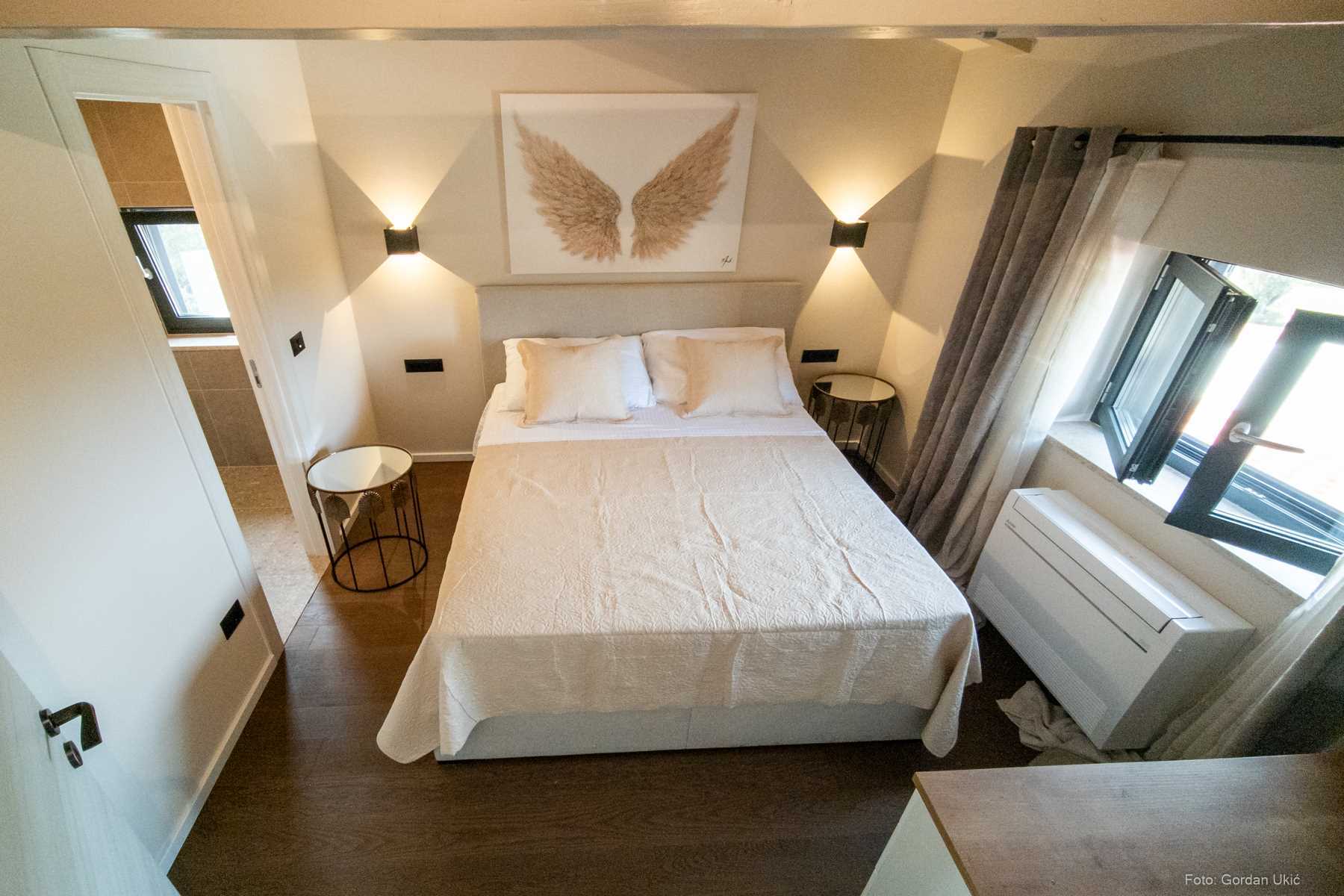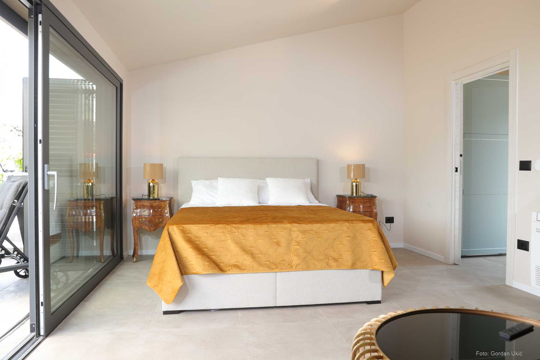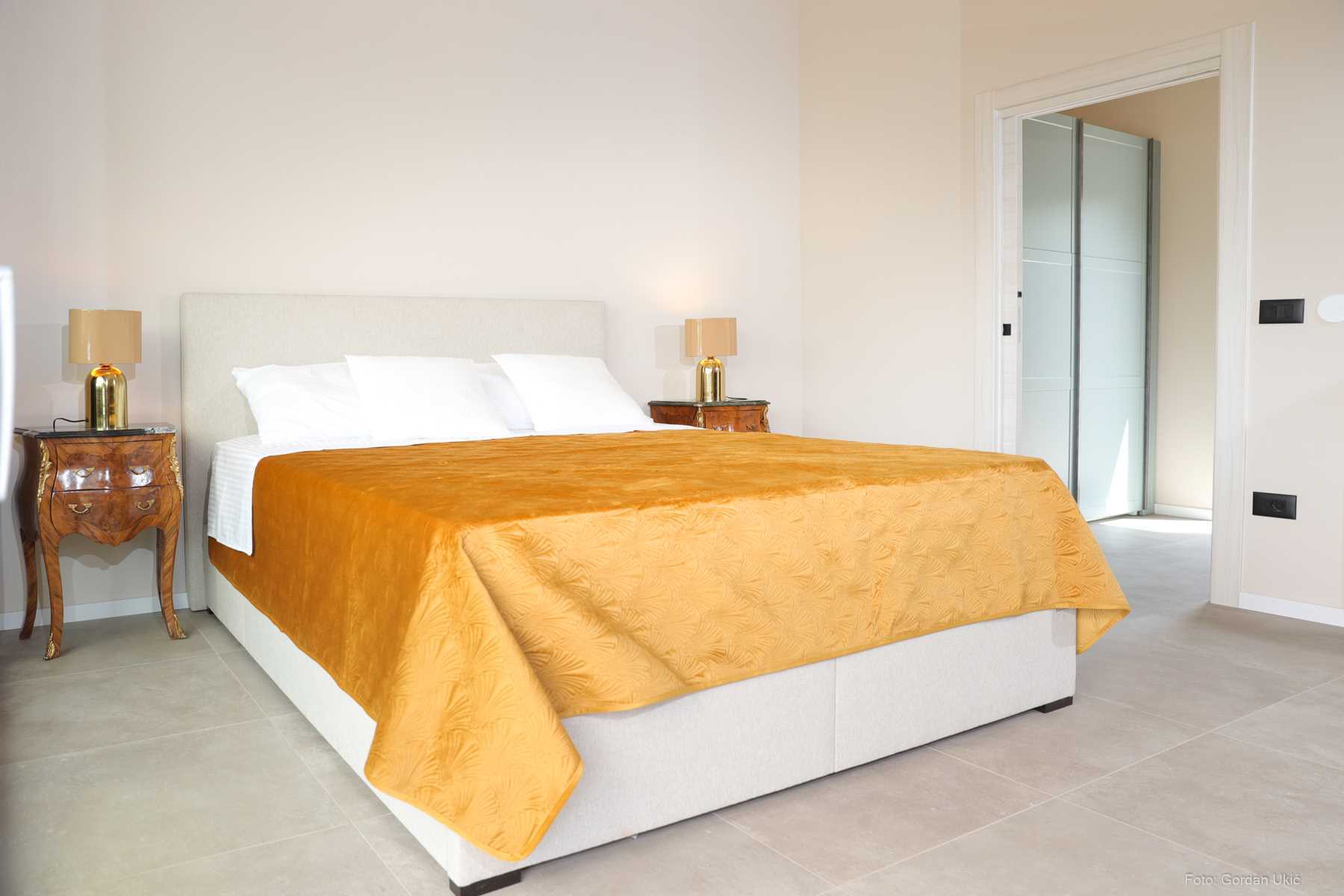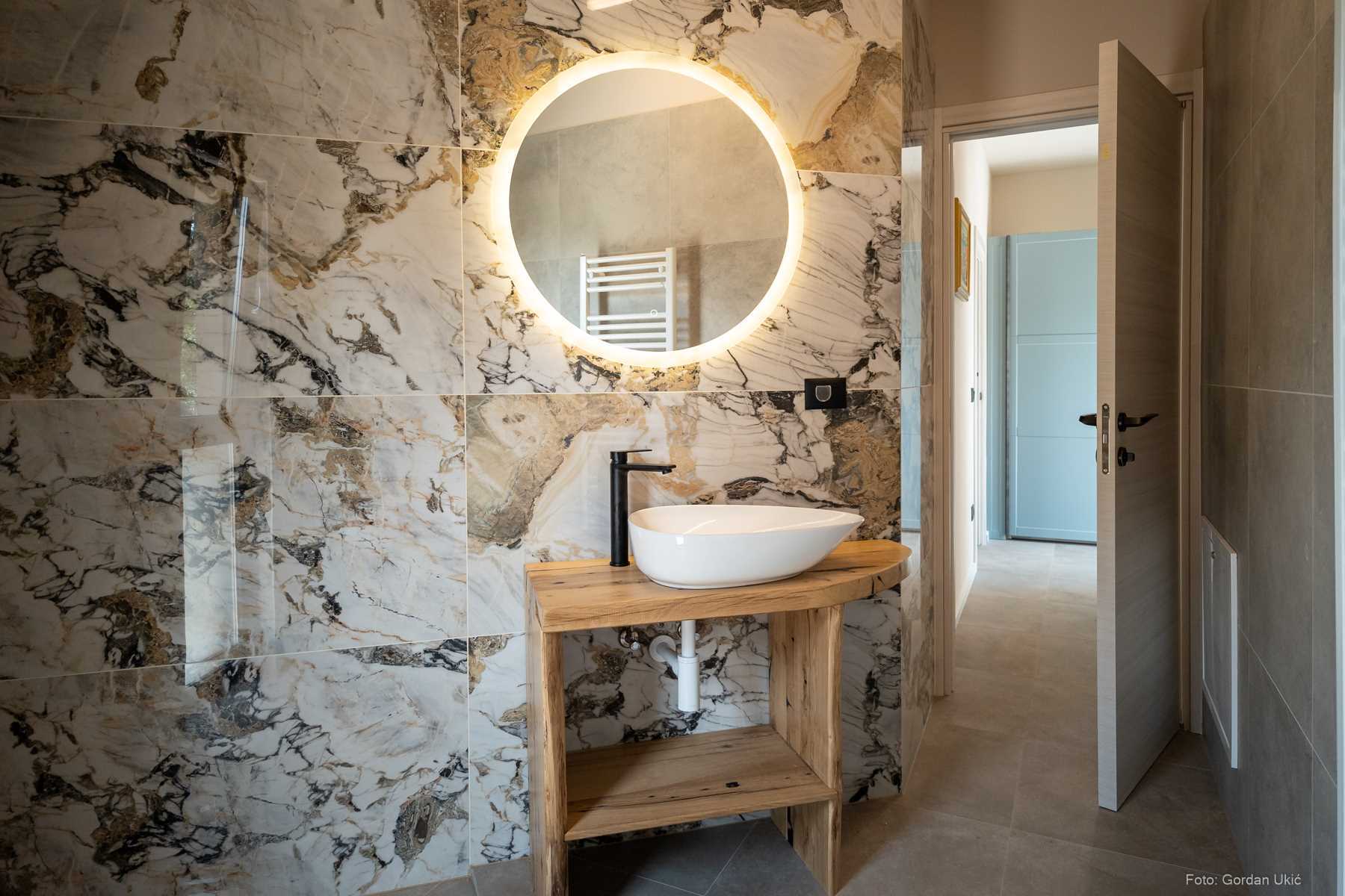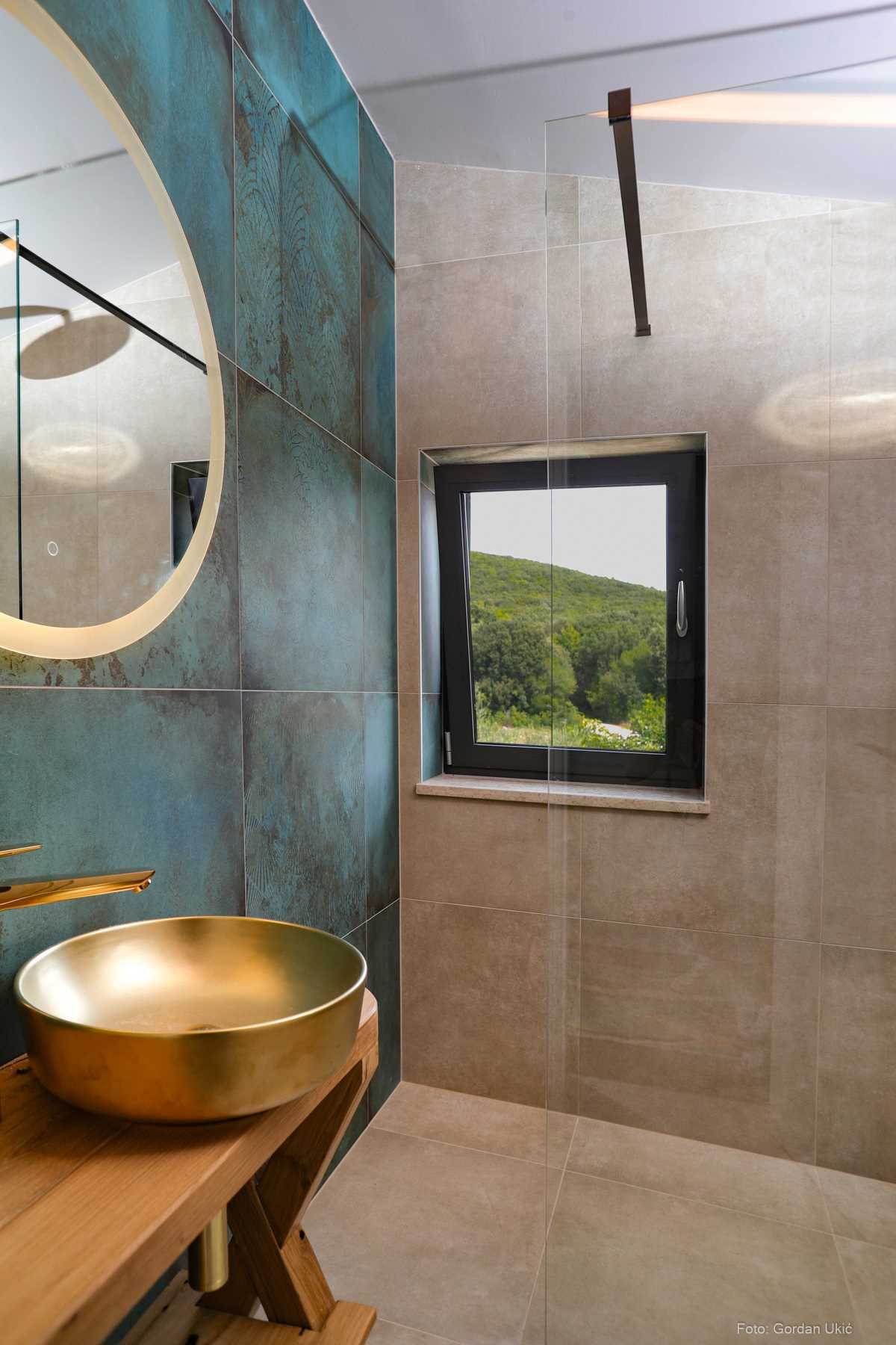 Going out to the terrace, there is an outdoor dining area and an outdoor kitchen you can use, as well as a barbecue grill. The terrace is also furnished with sun loungers and sun umbrellas to best enjoy in the amazing hot tub or in the fresh water of the swimming pool. The house is surrounded by a big olive garden (5000sqm) which makes it a perfect location for families with kids. The area is very calm and quiet so you can enjoy in the peace, the sun and the nature and simply relax! Everything you may need can easily be reached by car, but cycling, running and walking routes are all available close by, leading you to the gorgeous Rovinj beachline or to the town center.