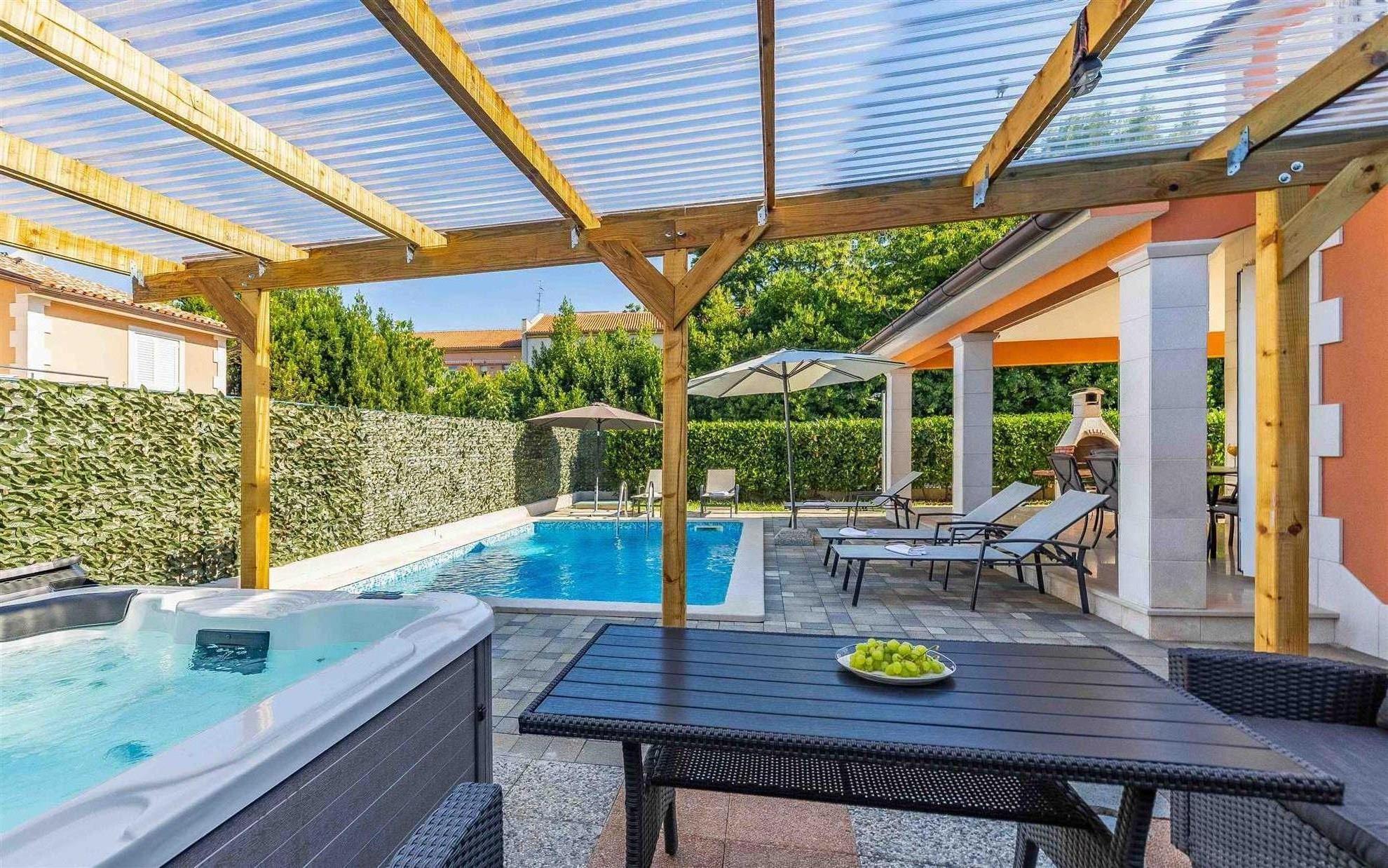 This beautiful villa in Pula offers a cozy and modern retreat, featuring three bedrooms, two bathrooms, a fully equipped kitchen, a living room with table football, a private pool, a covered terrace, a garden with BBQ, garage parking, air-conditioning, Wi-Fi, and SAT-TV, all conveniently located just a few kilometers from the beach and city center.
